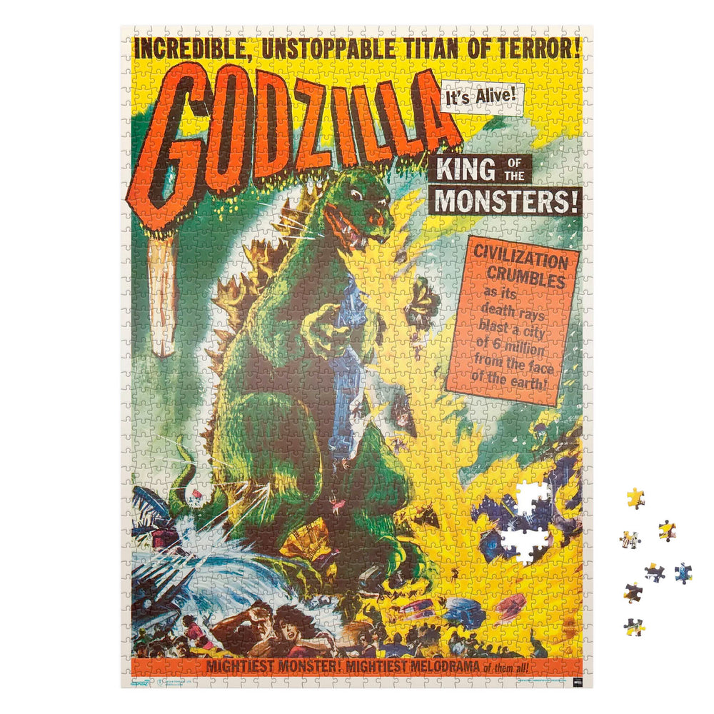 Just think of how much work it must have taken when the Japanese film “Godzilla” was cut up, dubbed, and re-edited to incorporate American actors in order to make the U.S. market “Godzilla: King of Monsters” movie. In comparison, assembling the new 1,000 piece Toho Godzilla puzzle based on that film’s 1956 U.S. market One Sheet Poster should be a piece of cake! With graphics, language, and layout specifically for the U.S. film release, it’s no mystery why the Toho Godzilla puzzle for “Godzilla: King of the Monsters” would be a great gift for any fan. We’re sure you can piece together the reasons why this puzzle should be at the top of your shopping list for any Kaiju collector! Puzzle measures 19" x 27"